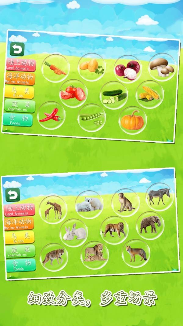 让边学声音边认识语文不再是梦想,让学习变得简单有趣!让除去在幼儿园里幼师的教导的时候,宝宝们也可以学到英文,认知动物和各种各样的事物。