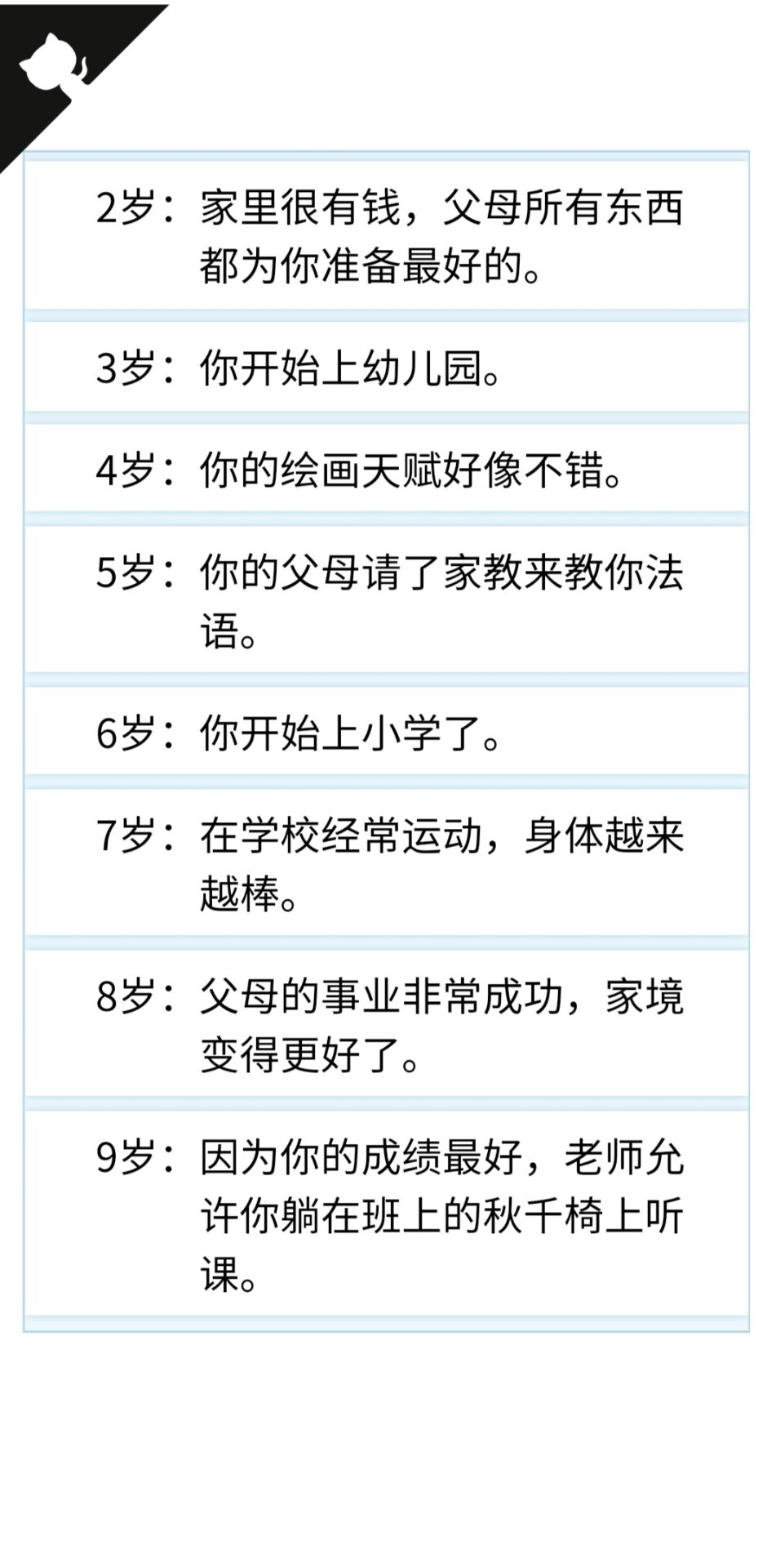 1.必备天赋:【神秘的小盒子】,没有则无法活到100岁,且无法进入修仙线。拥有该天赋并活到100岁时提示【你从盒子中获得了练气法门,突破到凝气一层。寿元提升到200年。】,同时,颜值、智力、体质均+3