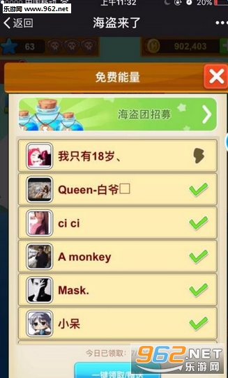 “海盗来了”小游戏,是由“头脑王者”团队打造的一款休闲游戏,其以海盗为游戏题材,创新了社交新玩法,一边游戏一边交友,其乐融融。