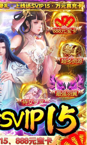 4、登录即送SVIP15、SR侍女、50000元宝、888万铜币