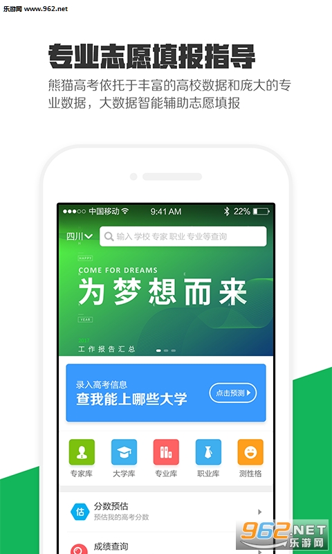 熊猫高考收录全国2964所高校历年录取分数、学校详情、专业排行和学生就业等庞大数据,利用大数据和核心算法精准预测大学录取分数、计算录取概率。平台数百位专家、学长学姐,在线实时提供填报指导和服务。