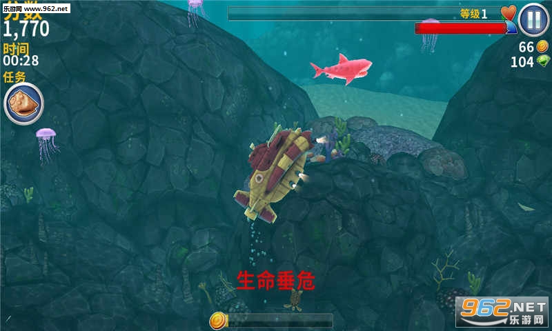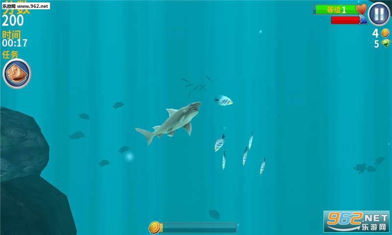 游戏支持触摸操作或重力感应两种模式,玩法轻松休闲。玩家可以扮演不同的鲨鱼种类,在海洋中掠食,称霸海洋世界,感受鲨鱼世界的生存法则。