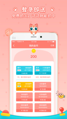 《喵星抓娃娃机安卓版》这是一款全新的手机抓娃娃软件。软件操作简单易懂,延迟率低,抓中率高,轻松就能抓到想要的娃娃。而且娃娃品质优秀,款式丰富,还支持全国包邮。新用户注册还可以免费体验3次。感兴趣的用户赶紧下载这款APP吧!