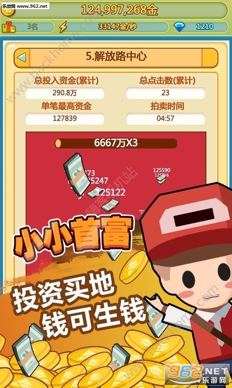 小小首富是一款模拟养成类手机游戏,玩家将真实体验一次穷屌丝大翻身逆袭成为大富翁的艰辛经历,不放过房地产、商场等各大商业的投资,制作富翁计划,实现你的人生梦想。游戏中还有更多趣味元素、新身份等你来体验,比如小偷、保安、管家等不同职业,也会有不同的富翁之路哦。