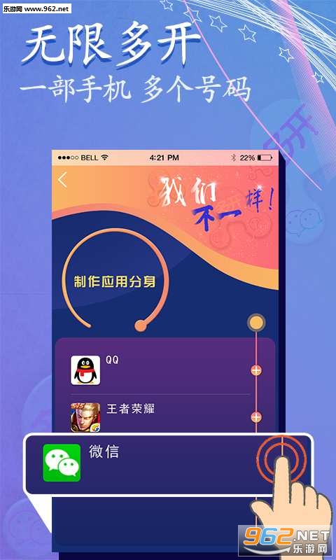 多账号,同时实现多开几个分身,且各个帐号间互不干涉,省去频繁登录麻烦,微商号不够用?分身帮你凑!让你的微商管理井井有条。一部手机多个账户,不同账号同时在线。告别裤兜一排手机的苦恼。