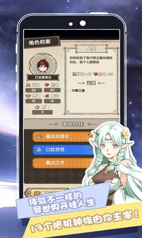 我在异界的开挂人生手游是一款非常好玩的趣味休闲文字类游戏,在这款游戏中使用了非常热血的二次元对战方式,并且在游戏中还有着属于自己独特的技能,精彩的游戏剧情故事,丰富的游戏玩法,在我在异界的开挂人生手游中,玩家将扮演主角穿越异世,自由挂机,享受精彩的战斗体验。