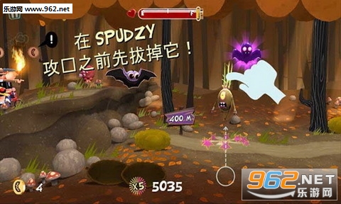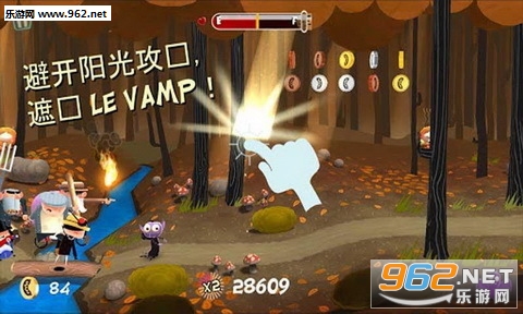 虽然以吸血鬼为背景,然而画面呈现却并没有太多的血腥阴郁。尽管丛林背景略显昏暗,然而湛蓝的河流,火红的小猪等艳丽的元素让整个画面活力十足。2D卡通画卷在横版推进的游戏过程中渐渐延伸,无论是奔逃不息的主角还是锲而不舍的追兵都以足够美感的形象出现,配合以各式各色的游戏元素和略显粗暴的动态效果,跑酷游戏的紧迫感得到了良好的缓冲。