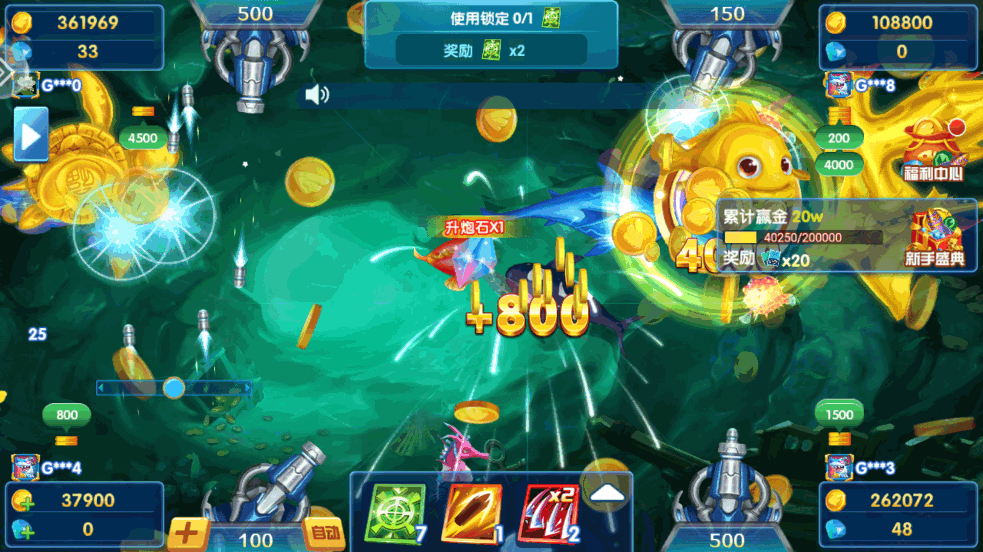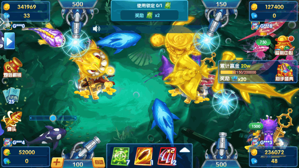 1、经典模式捕鱼玩法,四人同台,真人竞技。