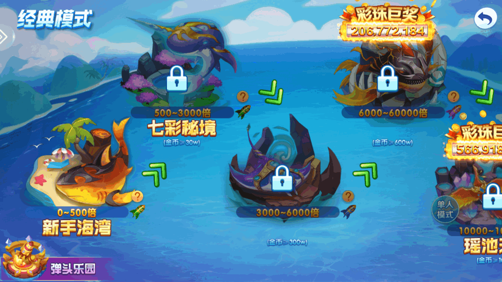 趣味的手机捕鱼游戏,有着经典场、比赛场等多种模式可以自由体验,有着丰富的场景可以解锁挑战,众多鱼儿登场,还有着炫酷的boss可以挑战,喜欢的朋友可以下载试试。