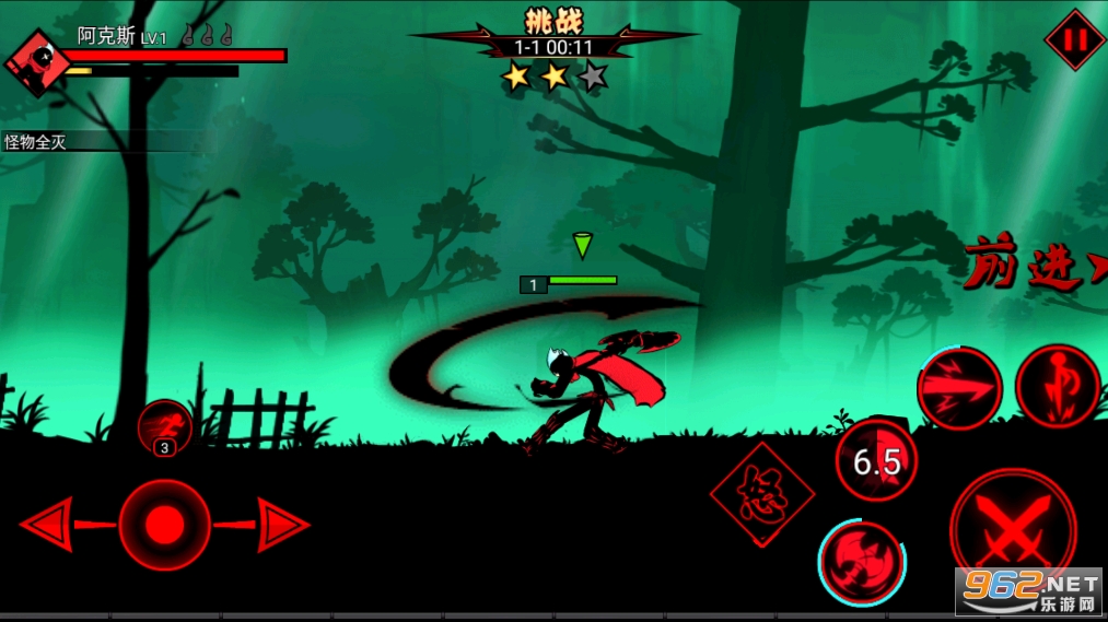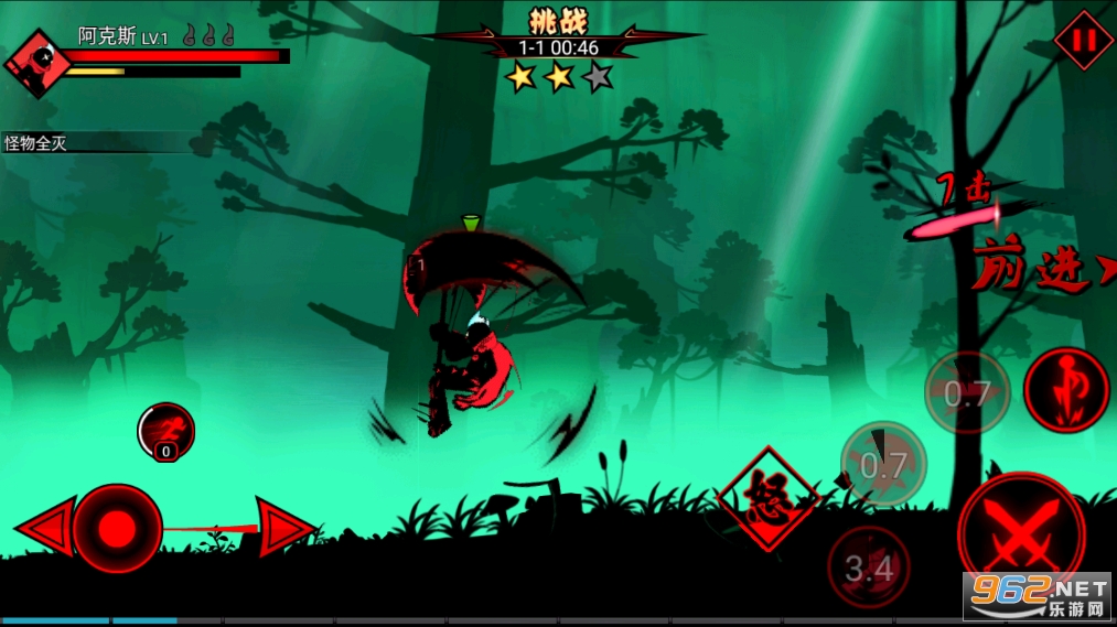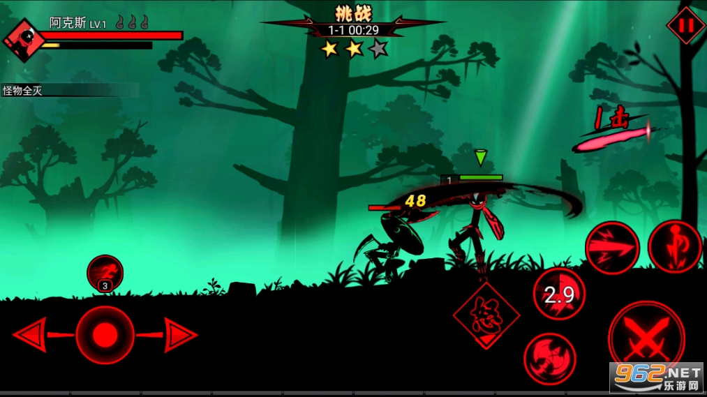 《火柴人联盟》的格斗采用了类似于街机格斗游戏的操作方式。玩家可利用左侧虚拟方向键,控制英雄前进后退,并配合右侧攻击组合按钮,完成普通攻击和4种技能地释放。
