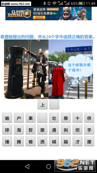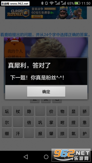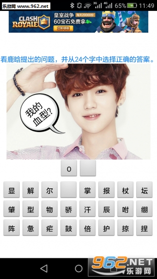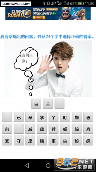 看看鹿晗提出的问题,并从24个字中选出答案。猜对了,真的粉丝,猜错了,没关系,重新点击再来过。是一款眼疾手快的偶像有趣游戏。 鹿晗个人简介:中文名:鹿晗; 外文名:Aries; 别名:清晨的小鹿; 国籍:中国; 民族:汉族;星座:白羊座; 血型:O型; 身高:178cm; 体重:60kg; 出生地:北京; 出生日期:1990年4月20日; 生肖:马; 其他成就:2015之夜年度男神; 职业:歌手; 毕业院校:首尔综合艺术学校; 影视作品:重返20岁; 音乐作品:MAMA