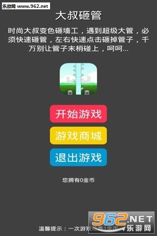一款考验人快速反应能力的趣味休闲游戏,玩一玩锻炼你的反应能力也不错哦,说不定你会上瘾呢? 时尚大叔变身砸墙工,遭遇到超级大管,必须快速砸管才能完成工作! 左右快速点击砸掉管子,千万别让管子末梢碰上或砸中末梢。