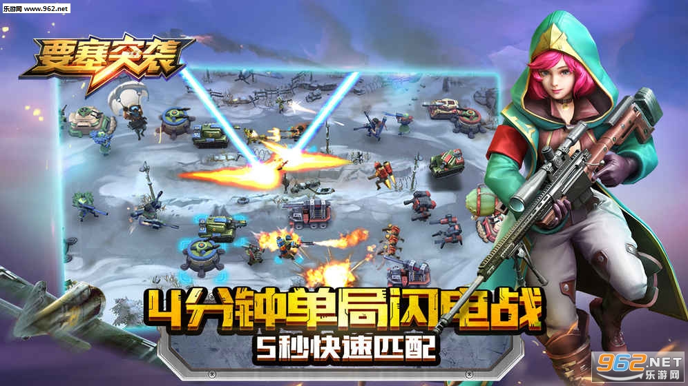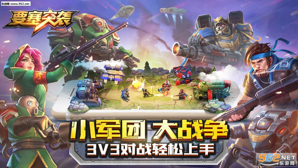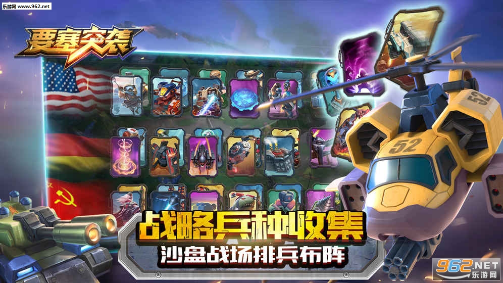 《要塞突袭》是由天象互动自研的3v3军事对战策略手游。游戏包含苏、美、德三个国家,极具特征的国家特性与卡牌特色,极大强化了阵营归属感和游戏策略性。游戏设定中将独特的卡牌收集与放置策略相结合,在模拟沙盘战场上展开4分钟一局的多人快速战斗。丰富的兵种对抗和克制、特殊英雄之间的狭路相逢让战斗充满变数。游戏节奏紧张,开黑对抗氛围浓厚,玩法规则简单上手,简约不简单!