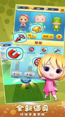 3、提供有多种道具可以使用,如飞机,安全帽,磁铁等,帮助猪猪侠跑的更远。