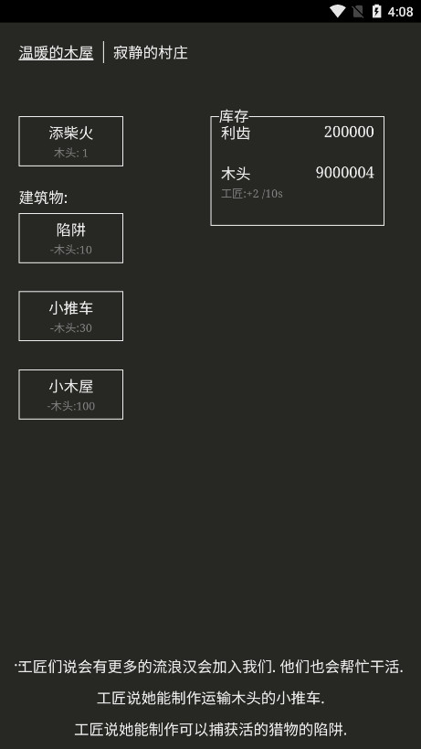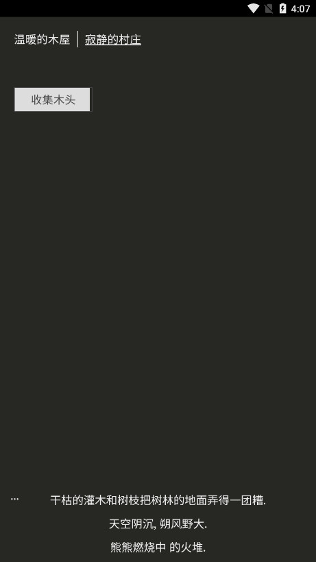 小黑屋A Dark Room游戏虽然只有文字,但却有很强的代入感,通过脑补逐渐描绘出各种人和物甚至事件,眼前逐渐浮现出各种景象,我们自己置身于一个荒芜的黑暗世界在冒险,后面就不仅是采集物资这么简单了,后面将会迈出村庄,探索这个世界,会遇到各种各样人、物、事件,甚至是战斗