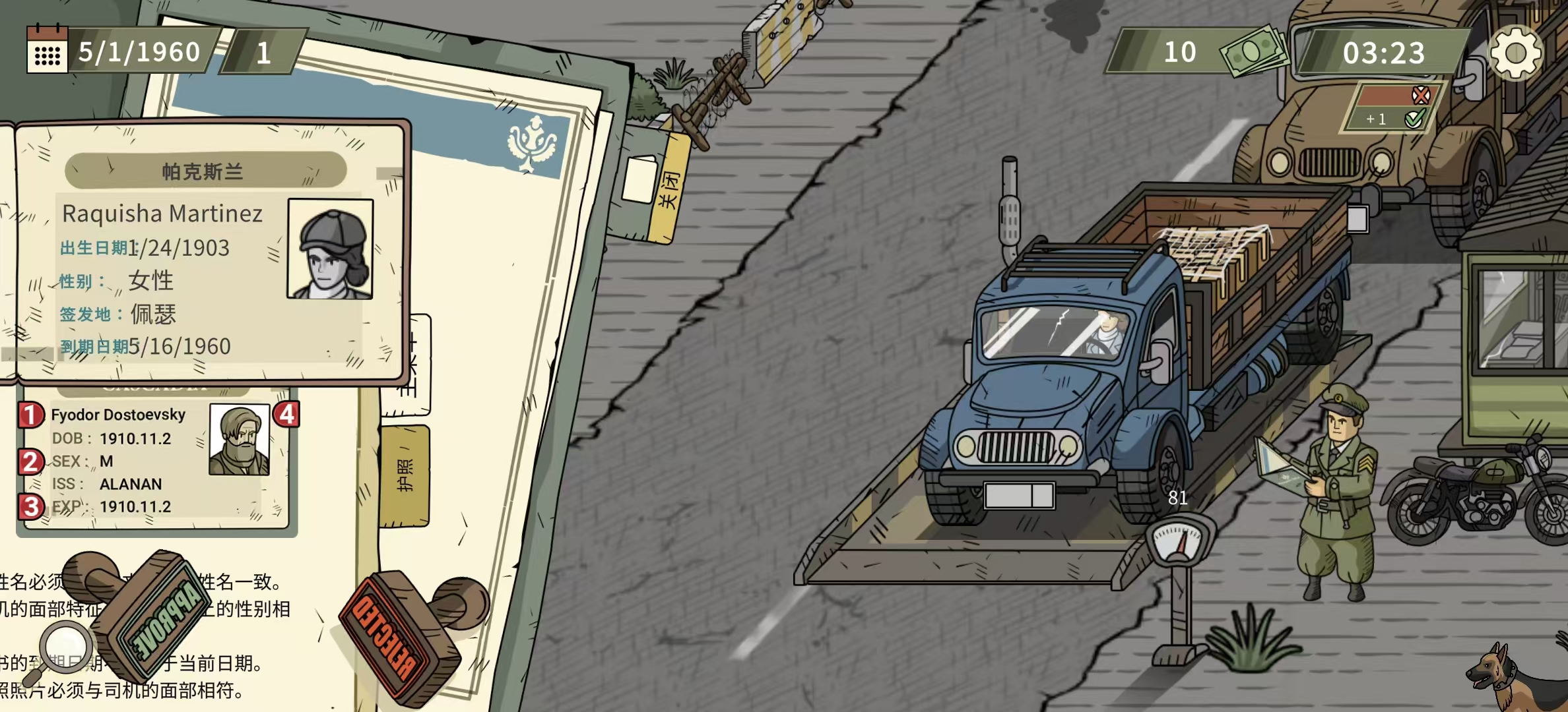 游戏设定在一个虚构的国家,玩家需要审查和处理过境人员的证件,检查行李是否携带违禁物品,同时处理各种突发状况。扮演一名边境地区的检察官,肩负着监督和执行边境法律法规、保障国家边境安全的重任。