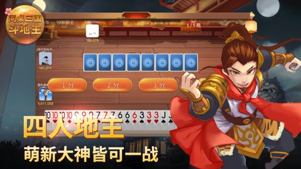 1、四人地主,以3农民配合打1地主,融入三国元素,全新玩法,等你体验。