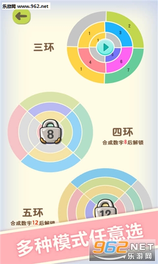 数字魔方是一款十分有趣,非常锻炼玩家大脑思维的小游戏。游戏难度有三种,三环,四环和五环,四环难度需要玩家在三环难度中合并到8以后才能解锁,五环难度需要玩家合成到数字12后才能解锁。
