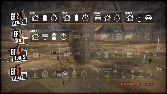 4、完全控制这些强大的龙卷风并摧毁尽可能多的东西,从 EF2、EF3、EF4 成长,直到您成为巨大的 EF5 龙卷风,吞噬建筑物、树木、汽车、谷仓和其他任何不幸挡在其路径上的东西!