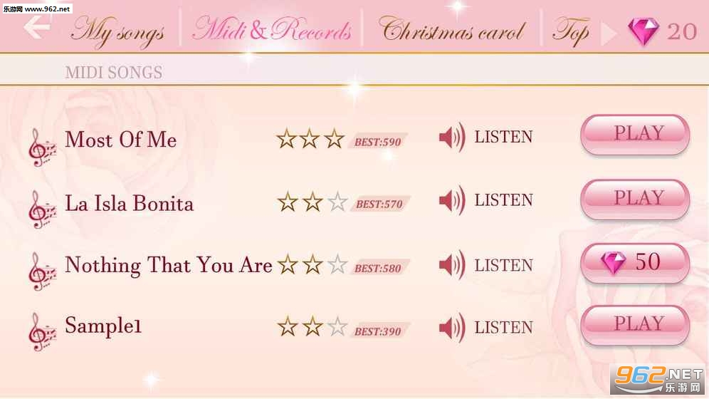 《粉红钢琴大师游戏安卓版》是一款休闲音乐游戏,画风简约玩法经典,你可以挑选一首喜欢的歌曲,对应钢琴键盘的正确建弹奏出来,每个音符的长度按键时间不相同,准确率也就不一样,最后得到的分数也会有差,快来下载试试吧!