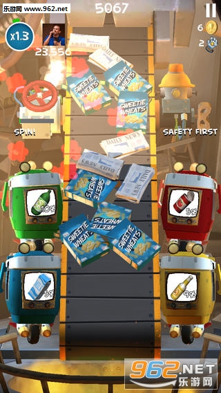 红色的易拉罐拖进红色机器人中,黄色玻璃瓶罐放在黄色机器人中,绿色的塑料瓶罐放在绿色机器人里,纸类垃圾放在蓝色机器人里。每一次分类你都要完成特定的任务,但你不用担心时间不够,游戏没有时间和关卡的限制,你就一直在那儿分啊分,直到你手忙脚乱把垃圾放错地方,消耗掉左上方所有爱心就输了。游戏中需要注意的地方之一,把垃圾放到对应的机器人中可以加分,而一次过把传送带中同类的垃圾都拖进机器人中,便获得几倍的得分加成。
