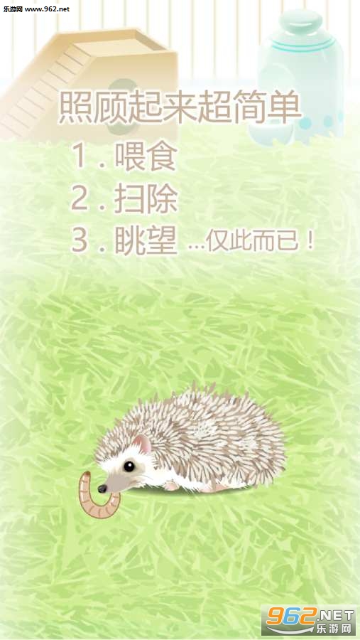简单的养成游戏,游戏玩法就三种喂食、打扫、凝望,不过需要小心的是,刺猬不可能一直那么的温顺,你在喂食或者打扫卫生的时候可能会要你的手,喜欢的朋友可以下载试试。