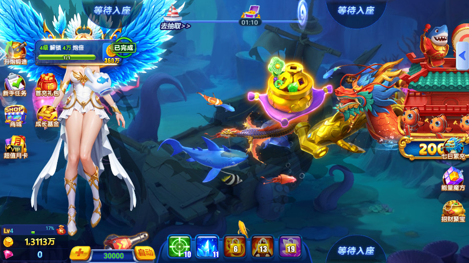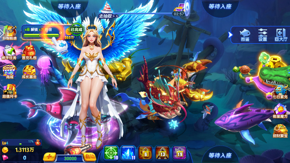 3、大鱼难以捕获,需要更强力的武器作为支撑,试着将武器提供更高等级,全面提高捕鱼几率;