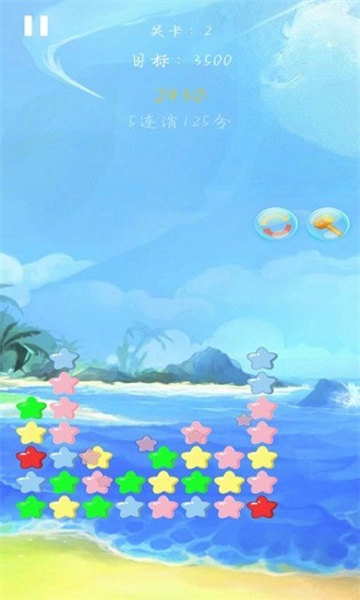天天消小星星的场景设计整体以海边为背景,画风清新靓丽,非常有自然气息,而且消除的音效和特效都是非常解压的,致力于给予玩家温馨舒适的游戏体验,游戏中的关卡模式十分丰富,玩家需要将星星消除才能获得分数,每一关都有分数要求,只有达到后才能解锁下一关,遇到困难的时候还可以使用各种特殊道具来帮助你通过难关,当你通关后就可以不断积累游戏奖励,越到后期,奖励就越丰厚哟。