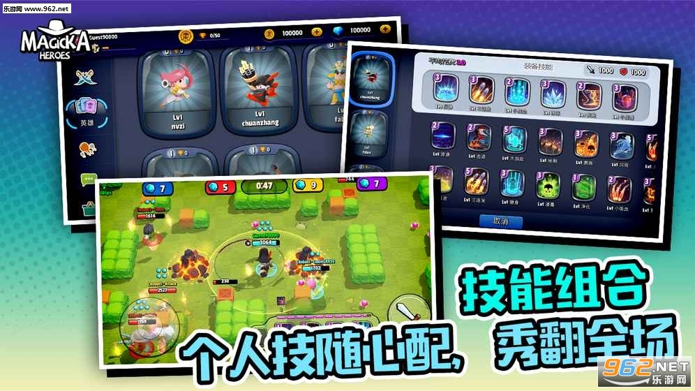 当前版本提供了5个英雄,21个技能。每个英雄可自由搭配6个技能。