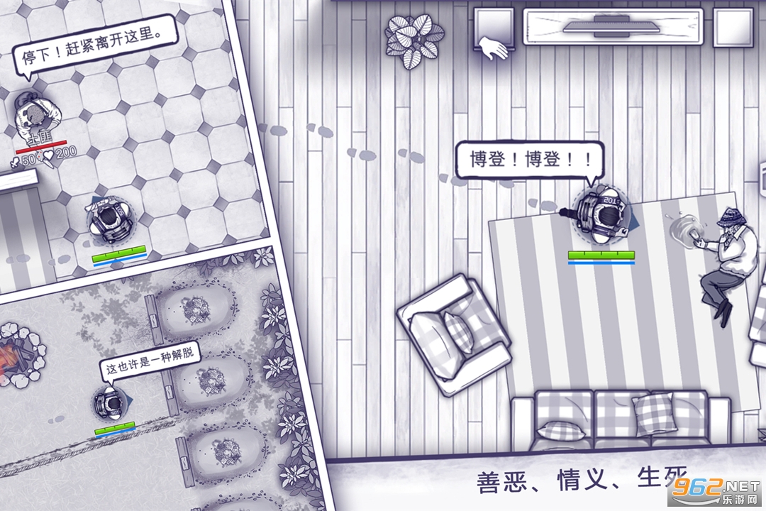 游戏中每个人物都拥有自己的故事,或凄惨,或热血,或温情,你可以与他聊天了解他的过去,也许能够有意外的惊喜;也能够帮助他们,但并非付出就有回报,可能你的善良会给自己带来危险;如果你需要一些物资,也能够选择交易;当然,如果你心中住着一个恶魔,那么打劫也未尝不可,一切都是自己的选择,也需您自己承担自己的选择。