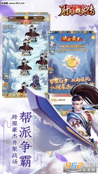 《射雕群英传》是一款经典武侠动作3D卡牌手机游戏,游戏融入轻操作立体化战斗,玩家可把握大招释放顺序,实现打断、秒杀等战斗技巧,游戏结合了卡牌游戏和SLG游戏的经典玩法,搭配全新的养成设计,开启了全民武侠;游戏的画风经典,福利丰厚,每日除了签到送还有幸运转盘、在线福利任意拿,福利一箩筐拿到你手软!且作为国内迄今为止唯一一款可以一统江湖的武侠手游,《射雕群英传》高还原的江湖地图,可以自由移动地点,挑战不同派系玩家,占据有利地势,夺取绝世武功秘籍。更有武林奇遇随机发生,让你感受真实的武侠世界,延续你的武侠梦想。