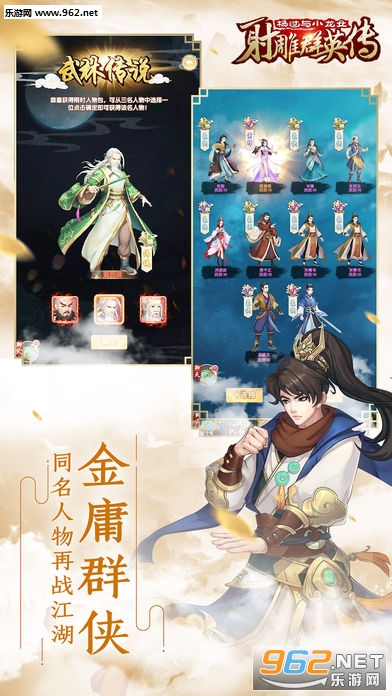 游戏收录了金庸武侠三部曲的知名侠客,且还在不断请入更多的侠客与他们的独家绝学。玩家需要根据各个侠客的特性,将侠客放在不同的位置,组合侠客间不同的搭配,攻略不同副本与难关。成为江湖之中的一代传说。