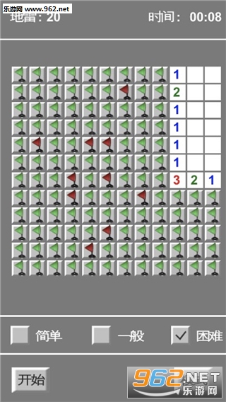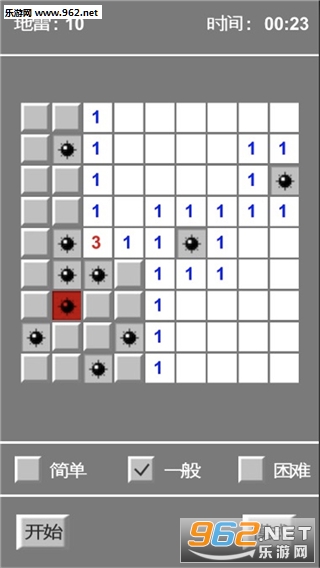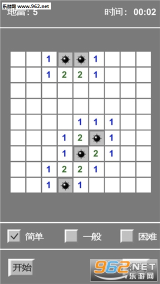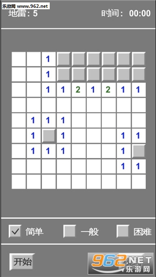 简单(5雷9X9)、一般(10雷9X9)、困难(20雷12X12)3种难度可供选择