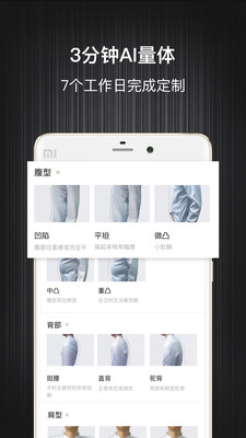 这里会根据用户的腹型、背部、肩型等多个部位量身定制,提供多种身型定制,包括腹型中的凹陷、平坦、微凸,背部中的直背、驼背、挺腰等身型定制,在这里用户可以完全不会担心没有适合自己的服装,这里的所有服装都是根据用户的身型替您量身定制。