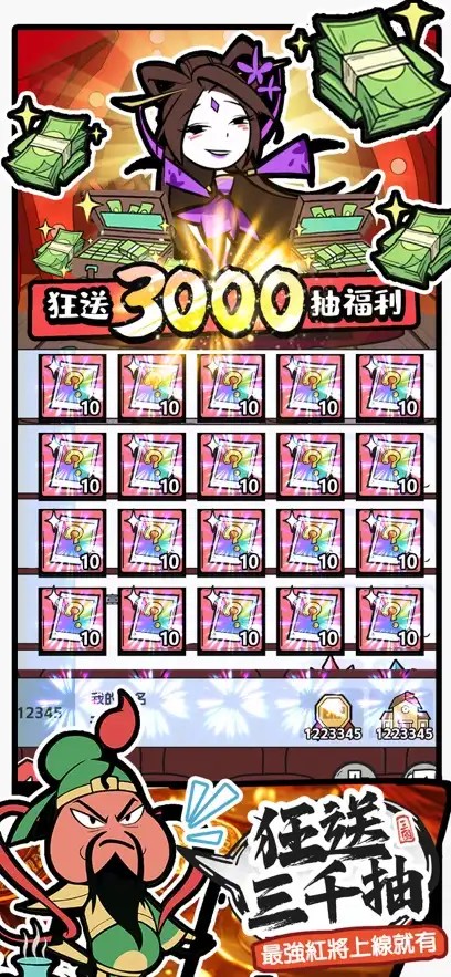我的武将塔塔开以三国为背景题材,收录了愁啊多三国著名战将,玩家可以自由选择你喜欢的角色,游戏的核心玩法是放置和歌词冒险,内置自动战斗系统和丰富多样的剧情任务,结合真实三国历史事件,不仅可以让玩家深入了解有关三国的历史纷争和传奇故事,还可以进入不同的副本中,开启属于自己的传奇经历,玩家上线后将获得3000次抽奖,全新挂机玩法轻松又简单,搭配搞笑幽默的角色设定,让你无时无刻不在捧腹大笑。