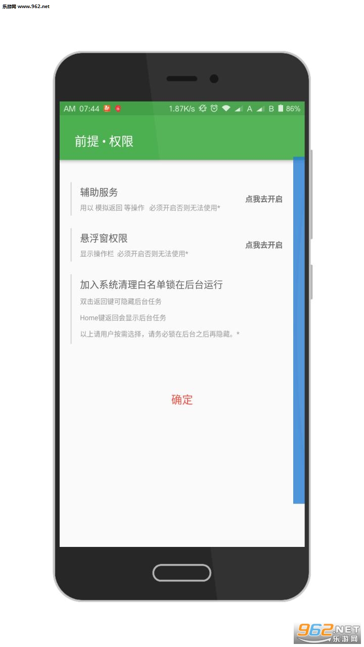 1.8.6:修复侧栏关闭BUG,加入隐藏后台,双击返回键返回隐藏后台,HOME键返回显示后台,将权限页面修改到了“无法使用请点我”,删除无用库,精简体积,更换UI(更简洁直观一些)