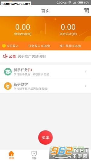 2、 登录后,接单入口出现,点击左下角“惠购”-“接单”,完善资料,开始接任务