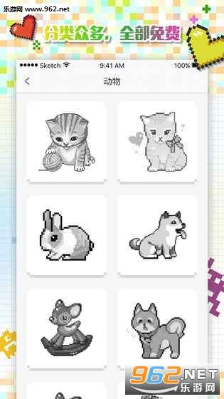 《格子画手游安卓版》是一款寓教于乐的像素风儿童涂色类游戏,游戏的玩法非常的简单,在游戏中小朋友只需要选择自己喜欢的一幅黑白图画,然后利用你手中的水彩笔为这些小动物或者是卡通角色涂上美丽的颜色的颜色就可以了,游戏没有固定的涂色模板哦~小朋友想要涂什么颜色都是可以的呢!喜欢这款游戏的小伙伴儿赶快来下载吧!