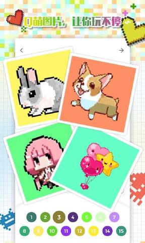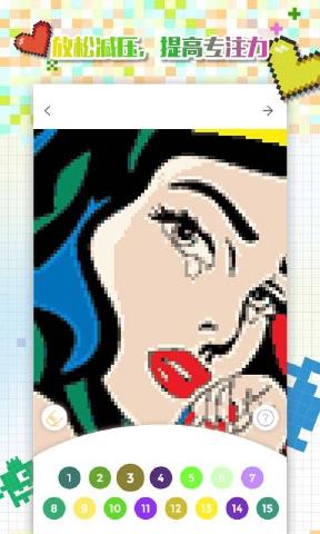 格子画更像是一本像素涂色书,它像一个像素工厂为用户不断地生成新的像素图片,每一副像素画都是由一个个带数字的方块组成,你只需要根据数字选择颜色在方块上填上颜色就可以完成图画了,简单的来说就是数字填、方块填色或者像素涂色。