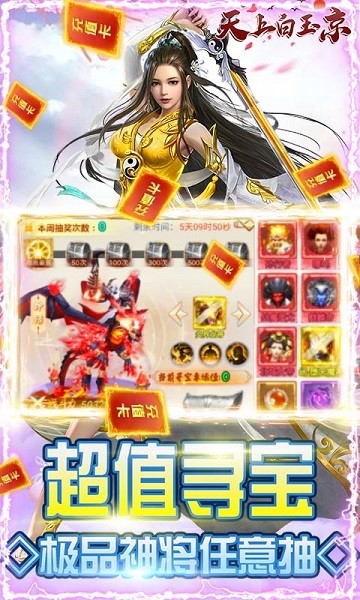 天上白玉京(GM直购全免)开局送直购币*8888,至尊称号,超值礼包,GM装备全部免费破解,钱包余额可直接兑换直购币! 登录壕礼送满星时装-聊斋妖仙/满星灵宠-毁灭死神/满星伙伴-血翼女皇! 98送直升250级经验丹,送50倍真充,送SVIP10,千人同屏,暴燃仙界大战,华丽百变时装,极致体验战力飙升3000万!月卡激活卡,神兽-神·天狼星,元宝*888888,铜钱1亿! 全地图自由飞行,跨越千山万水,开局送20阶坐骑羽翼礼包,伙伴灵宠等百变玩法,畅游最精彩的仙侠世界。