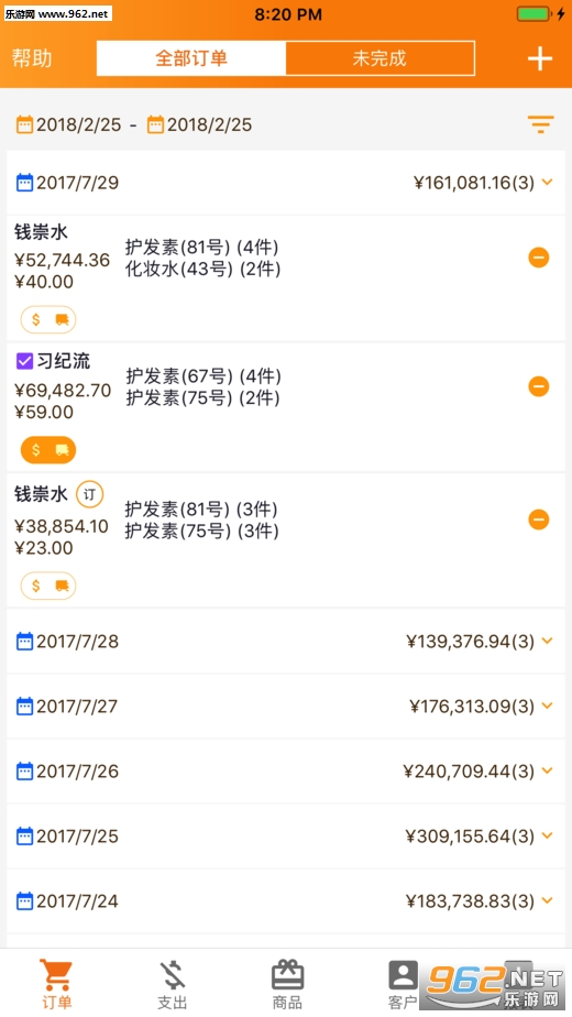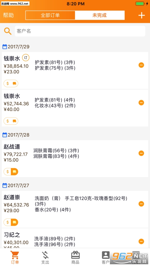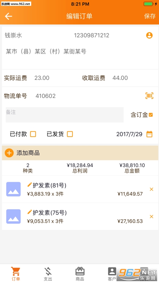 【客户】储存联系人信息,包含姓名、电话、地址,以及该客户的历史订单详情。每位客户的购买力纳入报表统计。