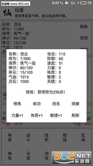 文字修仙放置类游戏,玩家将享受轻松挂机的升级乐趣,各种探索战斗挂机功法坊市玩法多多,喜欢放置类修仙游戏的玩家不妨试试。
