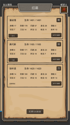 2、根据镖局需求,招募不同技能和属性的镖师。