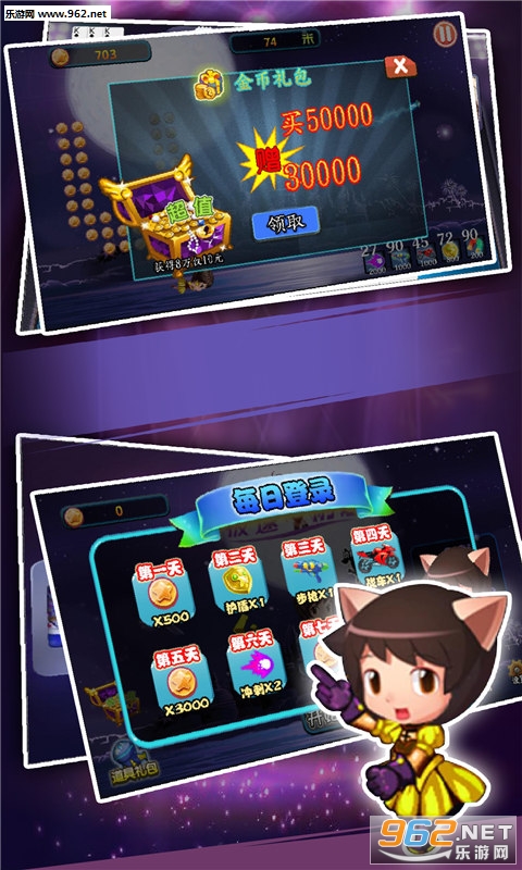 1、灵活的操作来躲避各种危险和关卡,收集金币还可以解锁全新的角色