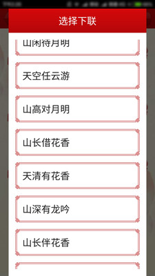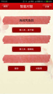 智能对联可以根据上联自动生成下联和横批,用户给定上联,应用自动提供若干下联供用户选择, 用户可以通过交互手段优选字词来生成满意的下联;当确定一副对联后还可以生成若干四字横批供用户参考,还可生成精美的对联壁纸。除了自动对联外应用还收录了大量对联,包含春联,贺寿对联,结婚对联,节日对联,行业贺联,新居联,名胜古迹对联,格言对联,名著对联等各类对联。