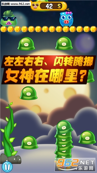 非常好玩的休闲手机游戏。玩家将帮助可爱的小猪,通过藤蔓追回即将离开的女神。诙谐幽默的风格,上手简单的玩法,操控小猪上下左右躲避不断落下的绿帽即可。比较考验的玩家手速和反应!