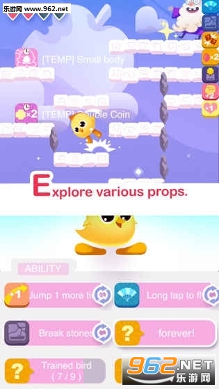 全新的休闲手游。好玩魔性的跳跃闯关玩法,简单上手,反复挑战而不腻,直到渐达精通,享受行云流水般的爽快操作。随机出现的上百种关卡,是不是很有挑战性。游戏中还有12中可爱角色、数十种技能道具、6段BOSS关、各种环境机关、敌人,让你目不暇接。喜欢的玩家千万不要错过,赶快加入《蹦跶鸟大作战(Jumjumfly)》!