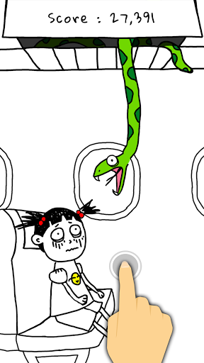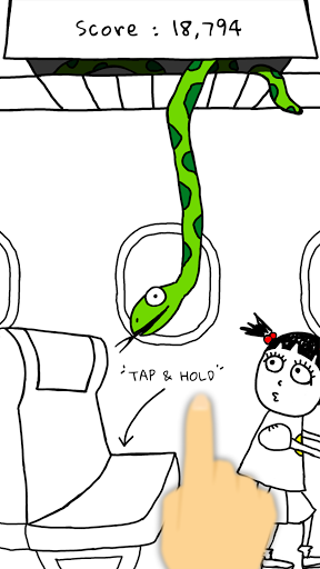 这是一款儿童简笔涂鸦画风的休闲游戏,目标非常简单,就是让小女孩逃离蛇吻。只要按住屏幕就能让小女孩坐下,接着就要专心观察她头顶那条蛇的动向,在其要袭击小女孩时松开手,让她及时从座位上逃开。