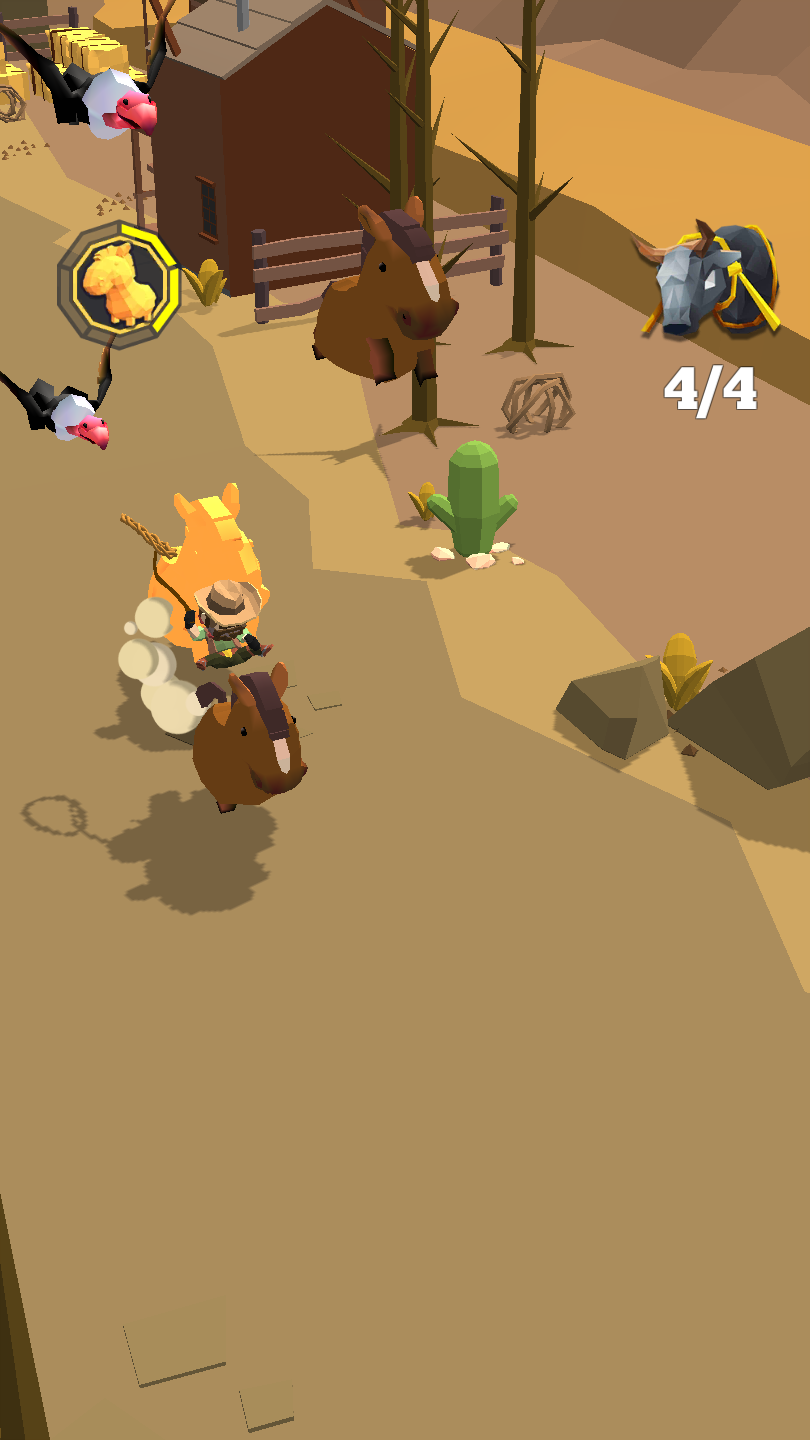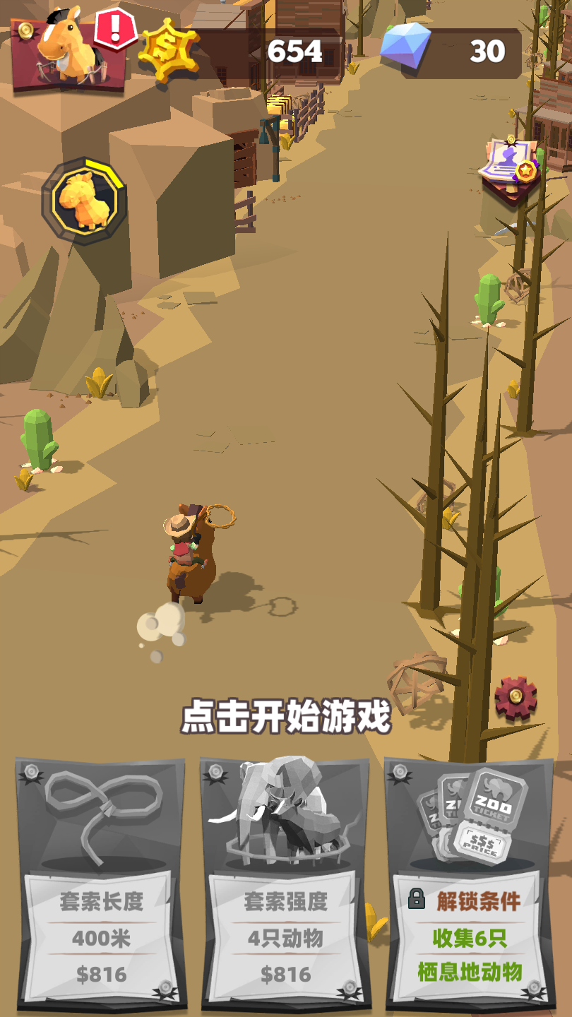 画风比较倾向于西部牛仔画风,玩法比较轻松,套住小动物就可以;