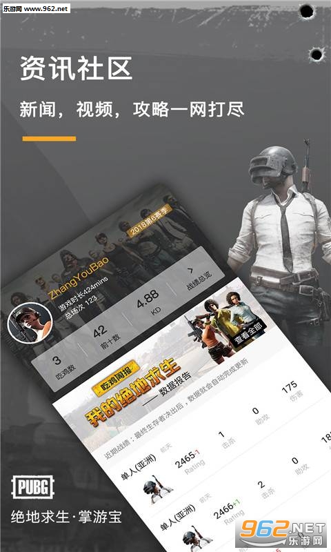 《绝地求生掌游宝安卓版》是一款为绝地求生的玩家打造的游戏资讯软件,在绝地求生掌游宝app中你可以查看绝地求生的各种新闻资讯,查看自己的战绩,可以学习一些大神的技巧,让自己不再落地成盒。